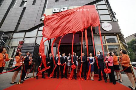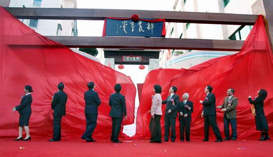 一般在商场、门店等营业场所新店开业庆典上,将事先蒙在牌匾、招牌、企业门牌、门头等标识上的红布揭开的一种仪式, 比喻隆重开业、重大事件的开始。