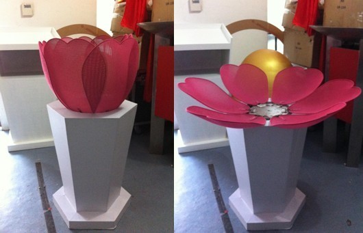 花开道具可选花朵颜色,领导撒下代表甘霖的雨水,或者按下科技感十足的触摸效果启动柱(适用于多个领导启动),花朵打开,LOGO升起闪现,代表活动正式开始,百花齐放!