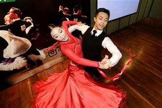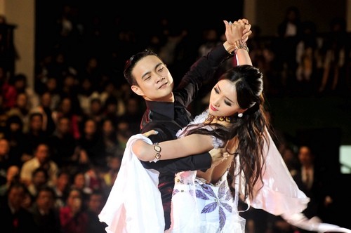 摩登舞是体育舞蹈比赛中的一个项目群,参加比赛的运动员男士要着燕尾服摩登舞西装,打领结,女士要着长裙,梳宴会正式发型。