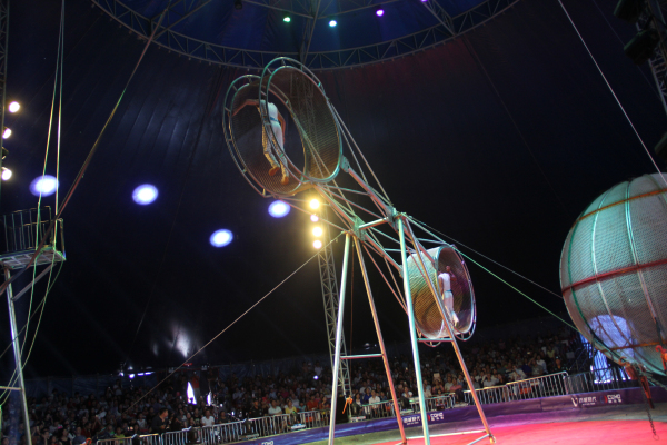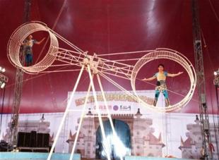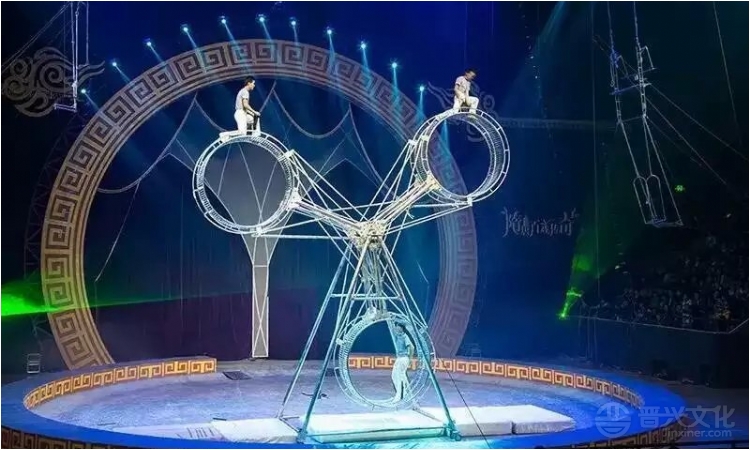 三个大轮飞速旋转,最高处离地面足有11米,演员在飞速旋转的高轮上行走、跳绳、抛接瓶子、蒙眼空翻……做出各种高难度的表演,此前该项表演所到之处无不惊艳四座。那稍纵即逝与死亡擦肩而过的刺激,也是本节目最大的看点。