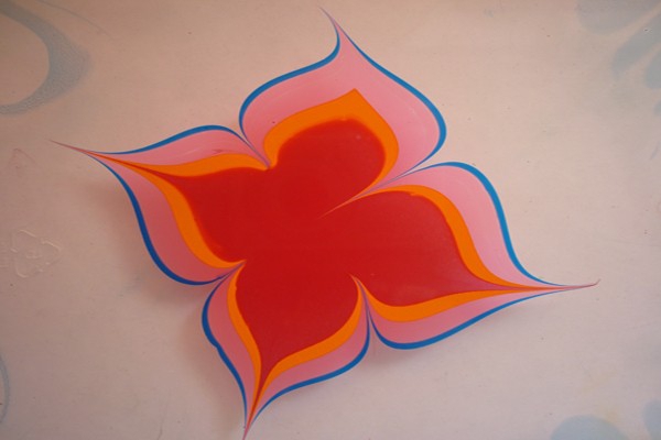 形成不断变化的美轮美奂的形象或者唯美的花纹,给人以深刻的视觉体验和哲学感悟。表演结束后用宣纸轻铺水面,可将水面上的画进行拓印保存。